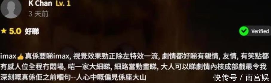 另一位观众则表示,一定要看IMAX版本的,视听效果一流,剧情好看,片中有亲情、友情,故事情节感人,笑点到位,适合全家一起看,因此这位观众也给出了5分好评。