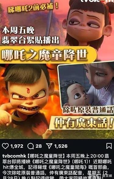 原来,翡翠台将在2月28日晚上8时播放《哪吒1》粤语版,算是弥补了这一遗憾!